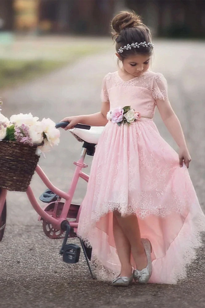 THIS ITEM RUNS ONE SIZE SMALL, WE ADVISE ORDERING UP. This vintage inspired lace gown is absolutely stunning! With french eyelash edging, this soft lace gown features a hi lo skirt and a removable floral belt. The short sleeves are finished off with a sweet ruffle and eyelash trim edging. This lace is extremely soft, never itchy and fully lined with soft cotton. Side zip. 100% poly self, 100% soft cotton lining. Machine wash, hang dry.