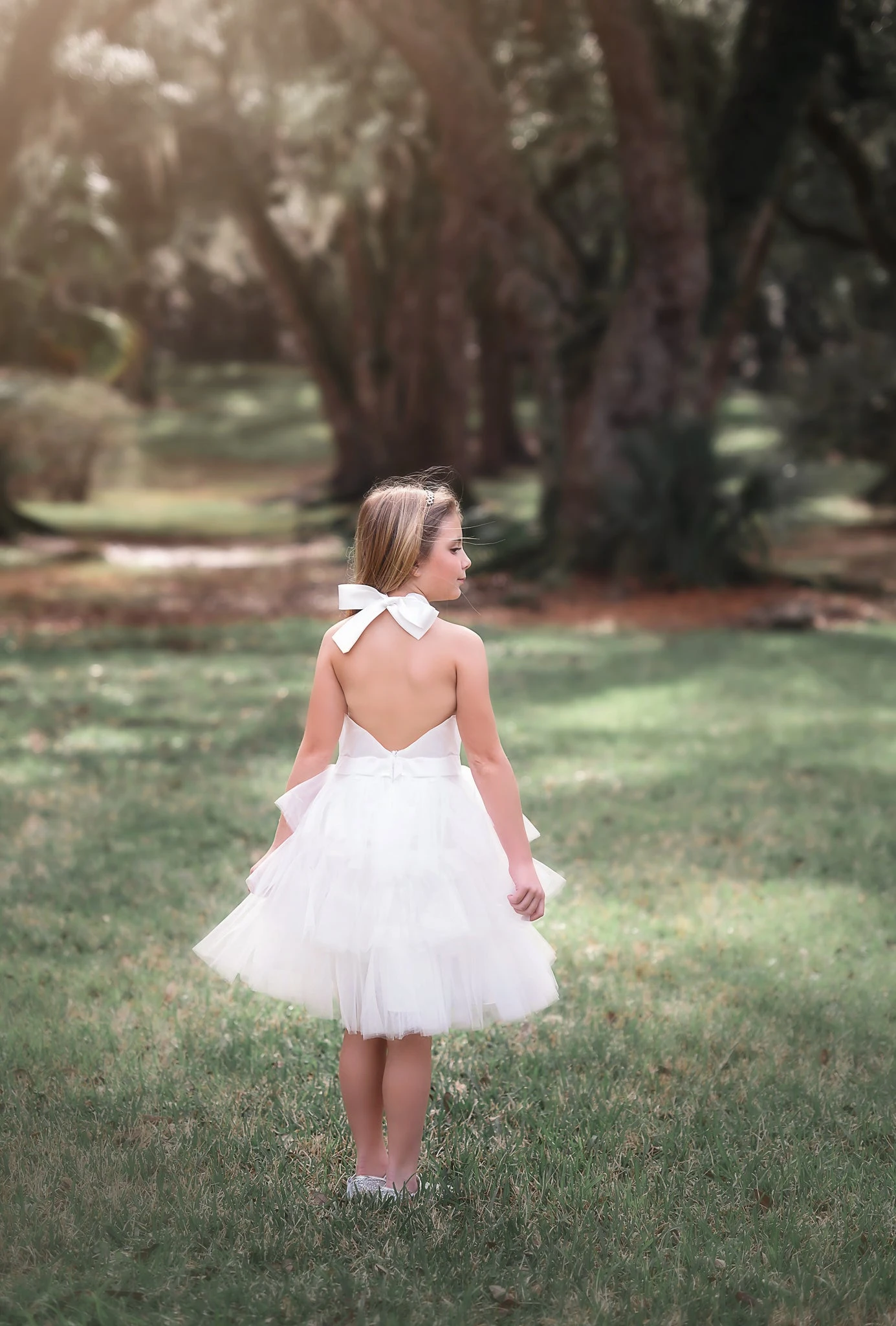 Meet Ameerah! She’s the perfect dress for a Summer day. 3 tiers of ruffled-tulle galore meet an elegant satin ribbon at the waistband and a tie-neck halter back for a look she’ll be twirling in all day.