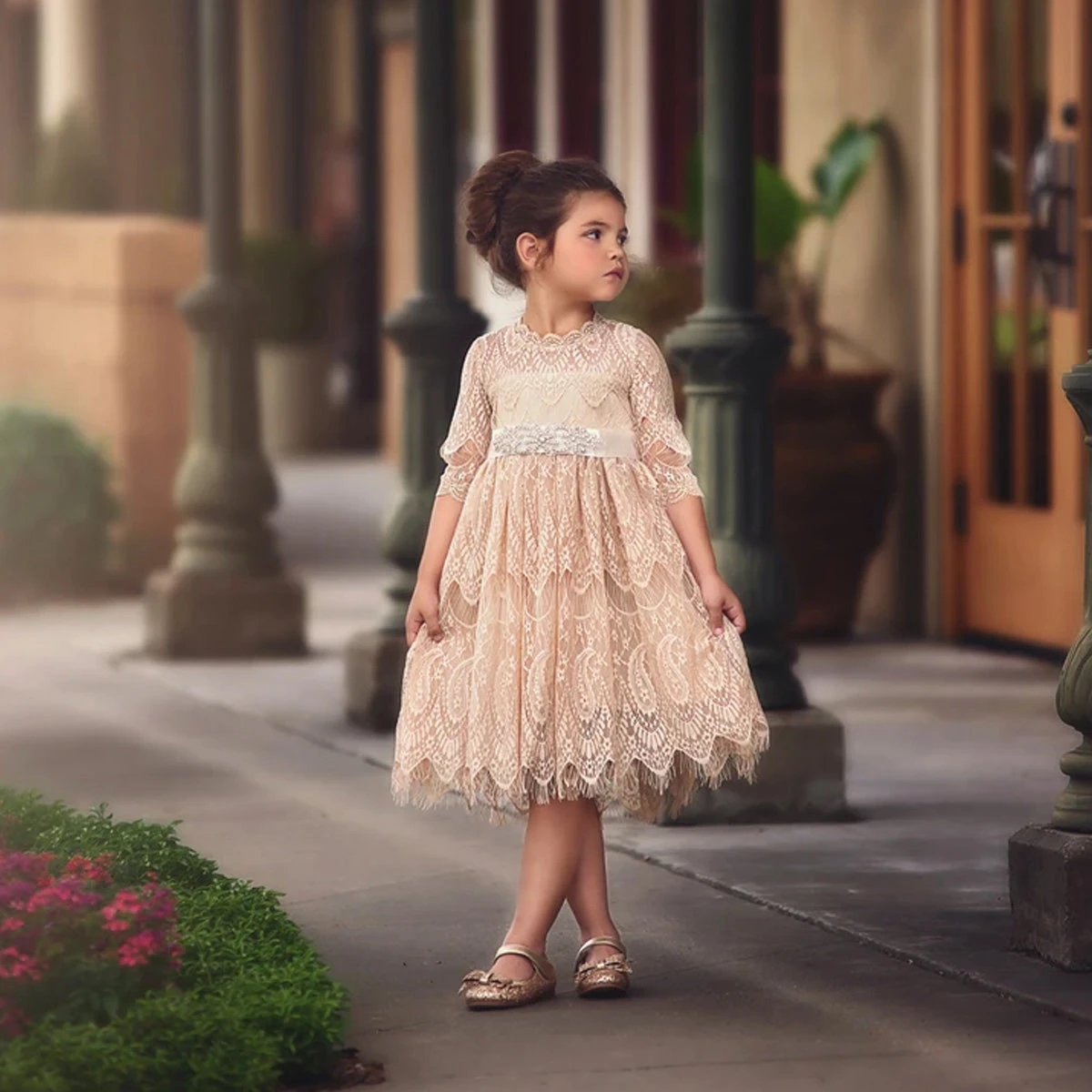 This vintage inspired lace frock is absolutely stunning in person. The color is a dreamy combination of gold meets butterscotch and photographs amazing. The lace is soft, not scratchy and has a French eyelash edging, creating a perfect touch of vintage whimsy. The dress is fully lined with soft cotton and has a back zipper. The sparkle belt is completely removable and self ties in back for just the right amount of glam. This color looks amazing on all hair colors and is a photographers dream to shoot. Machine wash, hang dry.