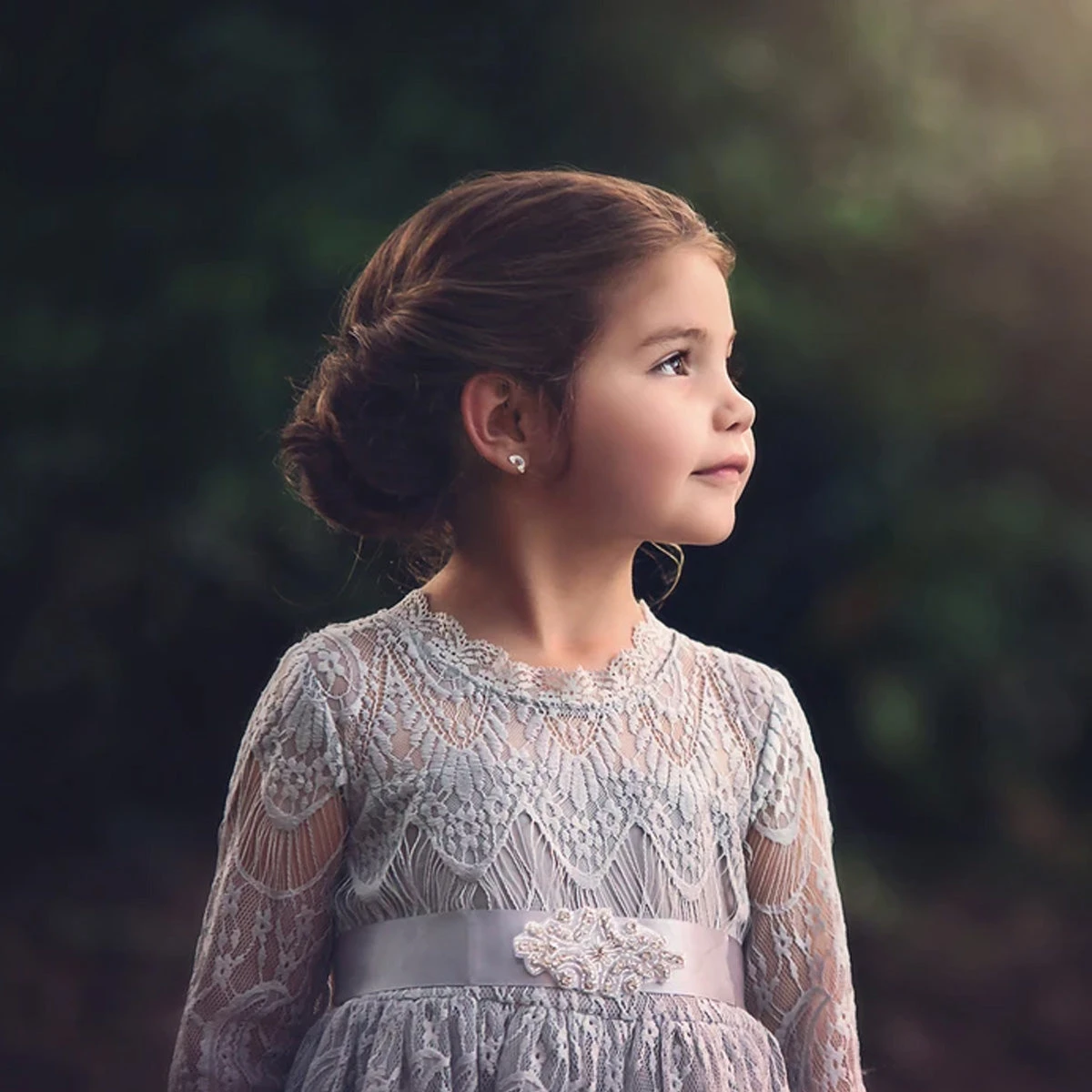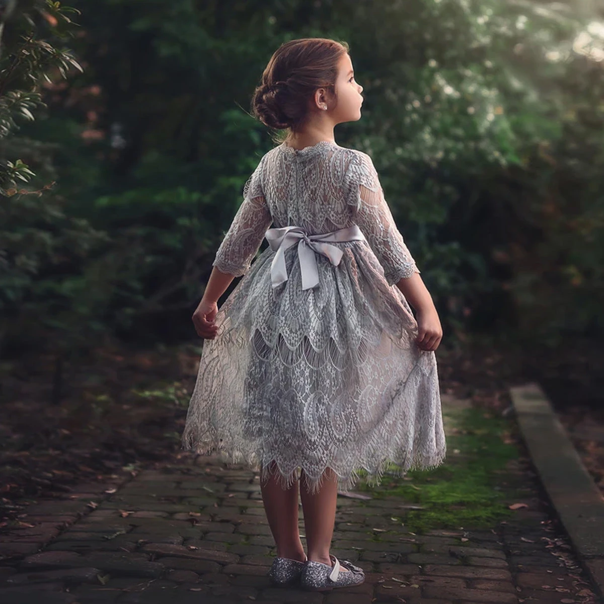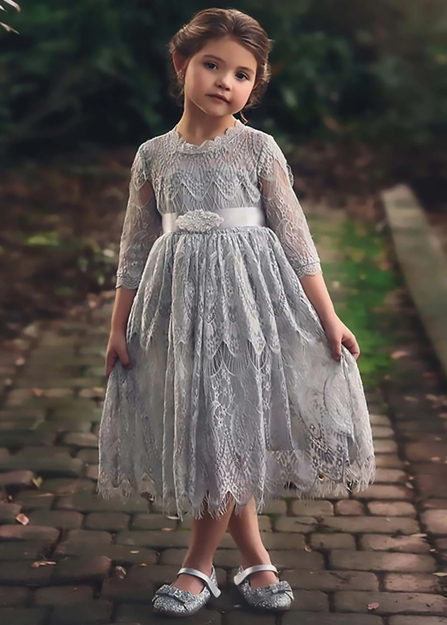 This vintage inspired lace frock is absolutely stunning in person. The color is a dreamy silver grey and photographs amazing. The lace is soft, not scratchy and has a French eyelash edging, creating a touch of vintage whimsy. The dress is fully lined with soft cotton and has a back zipper. The sparkle belt is completely removable and self ties in back for just the right amount of glam. This color is gorgeous and will be a photographers dream to shoot. Machine wash, hang dry. WE RECOMMEND REMOVING THE BELT DURING ACTIVE PLAY. THE BELT CAN SNAG ON THE LACE AND CAUSE DAMAGE TO THE DRESS.