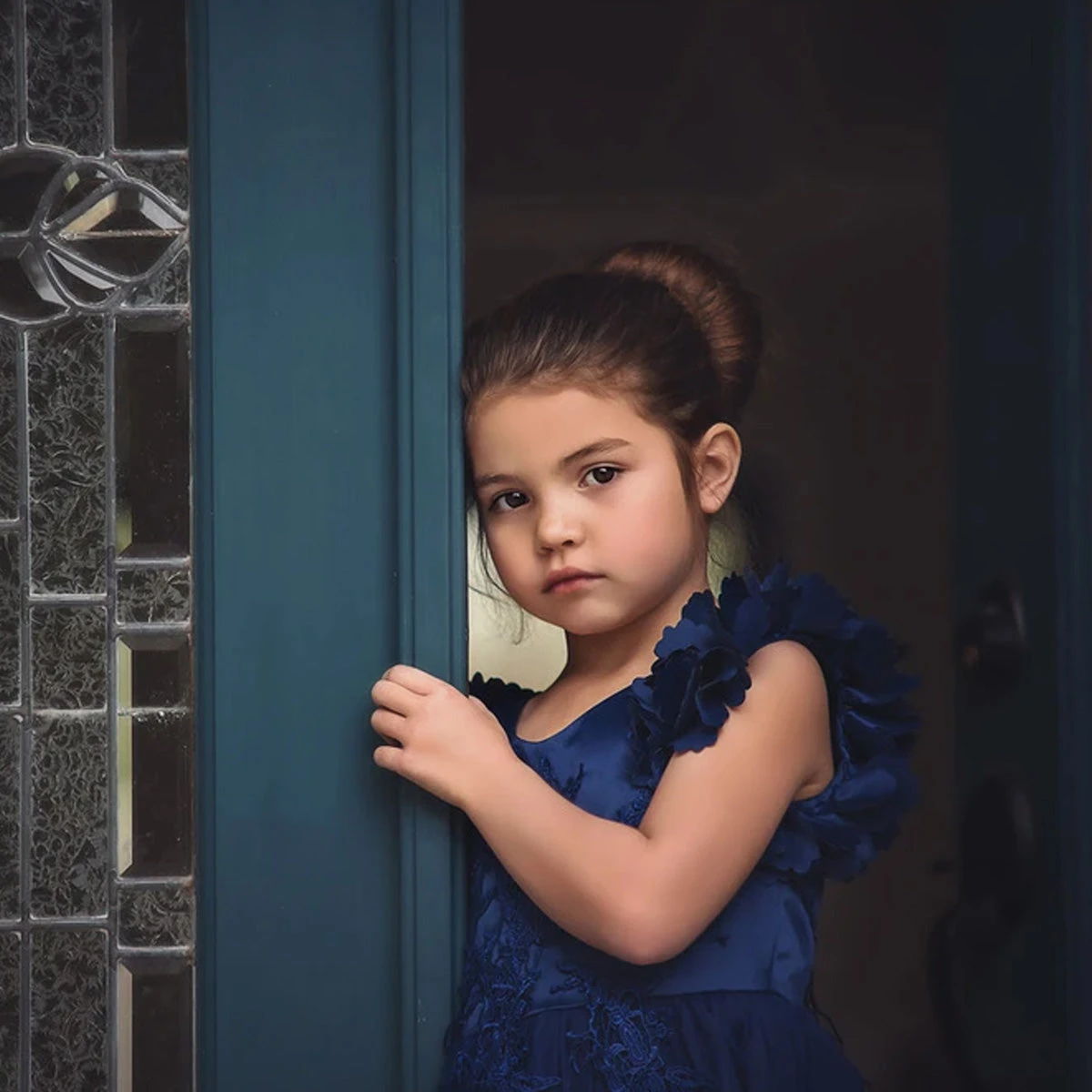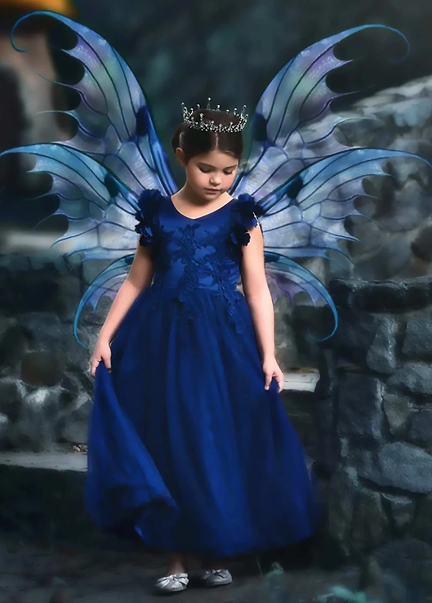 Fit for a princess, this dress has it all. Regal navy satin graced with a touch of lace, this dress is a showstopper! Sleeves are embellished with whimsical die cut flowers that will have all eyes on her. Tulling overlay skirt adds just the right touch of fullness and twirl. This is a gorgeous full length gown. Fully lined with soft cotton, back zip. 100% poly self, 100% cotton lining. Machine wash, hang dry.