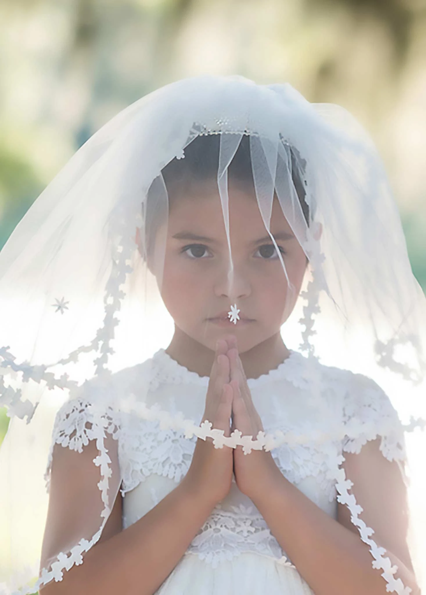 Sweetness has just arrived! She will have all eyes on her wearing this darling veil, fit for a princess! Multiple layers of tulle are perfectly trimmed for the sweetest frame around her face. The rhinestone tiara holds it all in place for the perfect touch of sparkle. This photographs so darling and perfect for wedding and communion clientele. You will love this! 100% poly, metal tiara, rhinestones.
