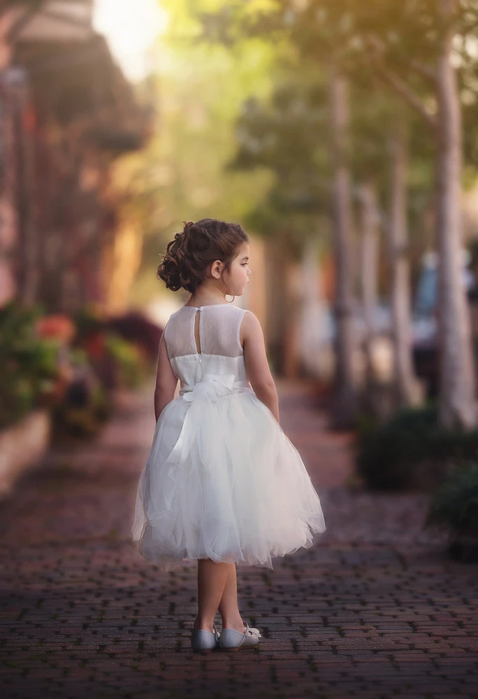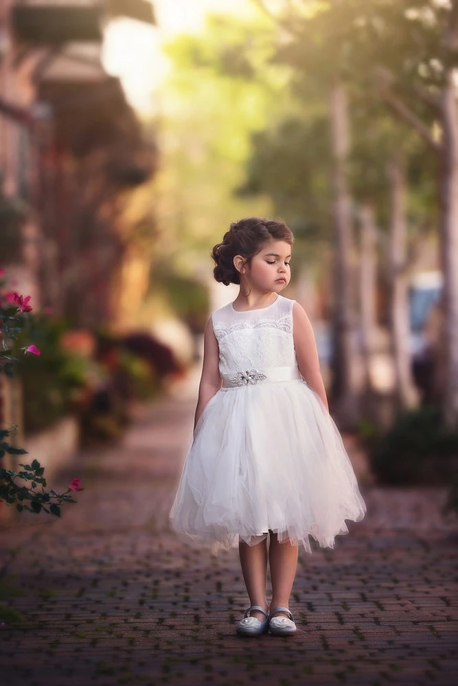This gorgeous dress will have all eyes on her when she walks into the room. A stunning lace covered bodice starts the look, while layers of on point tulling ruffles make up the oh so twirly skirt. A sparkle ribbon belt self ties in back, for just the right fit. This dress is a showstopper! Fully lined with soft cotton, back zip. Machine wash, hang dry. Belt is completely removable.