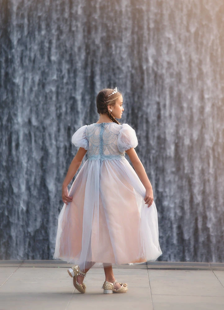 A little sparkle a little twirl, this gown has it all! Sequin and tulling scallops add just the right amount of sparkle to the bodice, a dainty poof finishes off the sleeve. The tulling skirt has a champagne lining for just the right touch of whimsy. This gown back zips and is fully lined with soft cotton. Machine wash, hang dry.