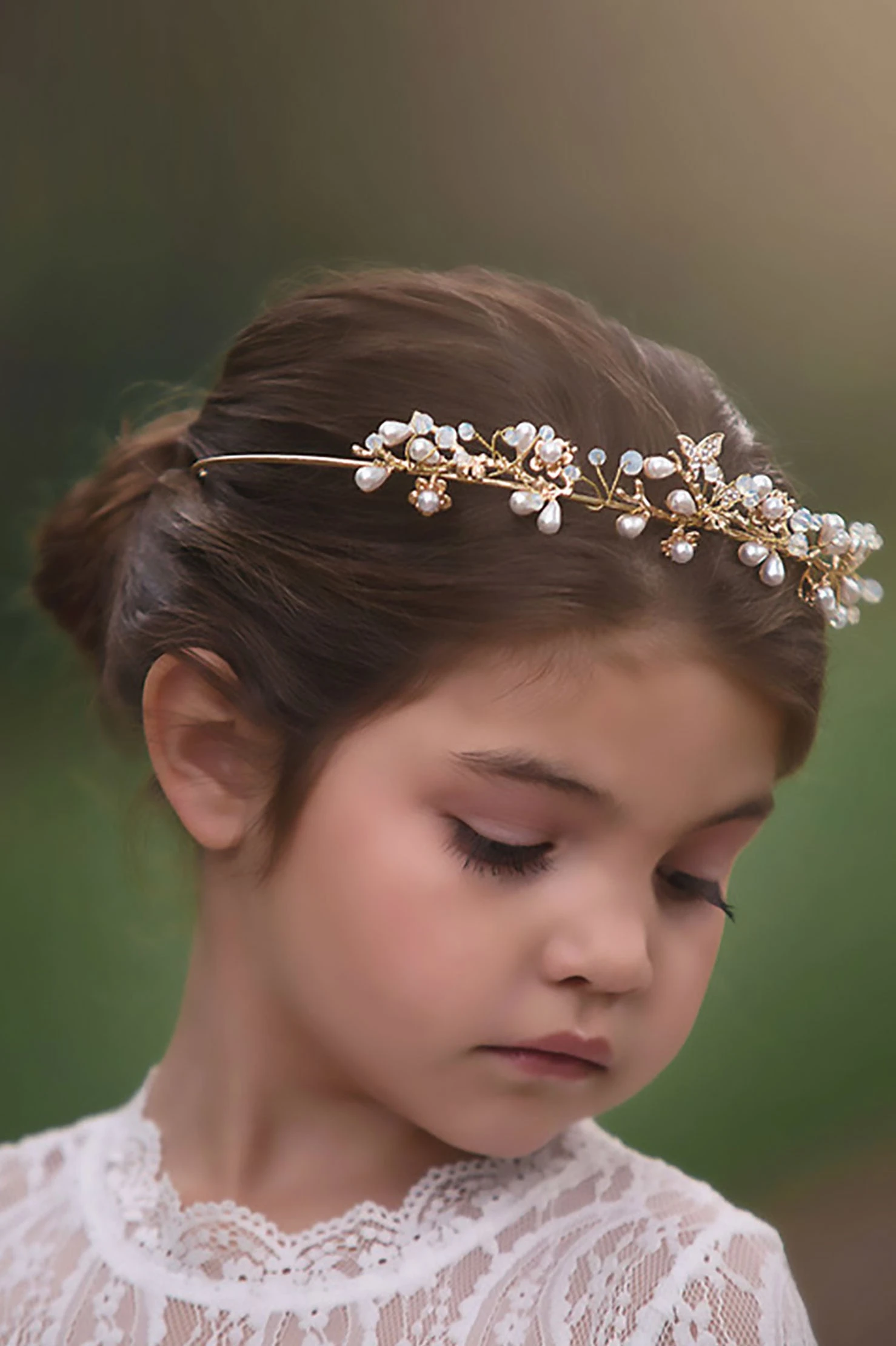 Adorable butterflies and pearls make up this golden touch of whimsy. A perfect companion to our dresses and a photographers dream to capture.