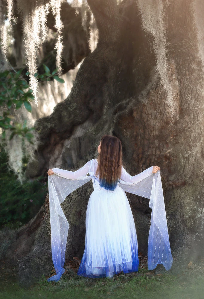 This magical gown will have her imagination soaring! Soft printed tulling with a hint of sparkle, this gown has it all. The regal jeweled cape finishes off her look. She will never want to take it off! Fully lined, totally soft and never any glitter. Elastic back. Machine wash, hang dry. DON’T FORGET HER MATCHING DOLL DRESS!