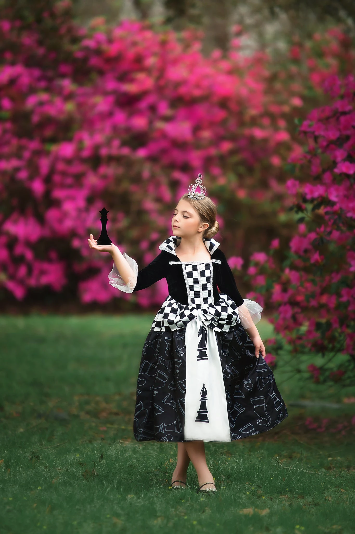 Make your move in! Meet the Chess Queen, a girly, ultra glam dress that will have her feeling like royalty! Featuring a velvet bodice, a checkered collar, polka dot tulle sleeves and a soft satin skirt, she can checkmate anything that comes her way.