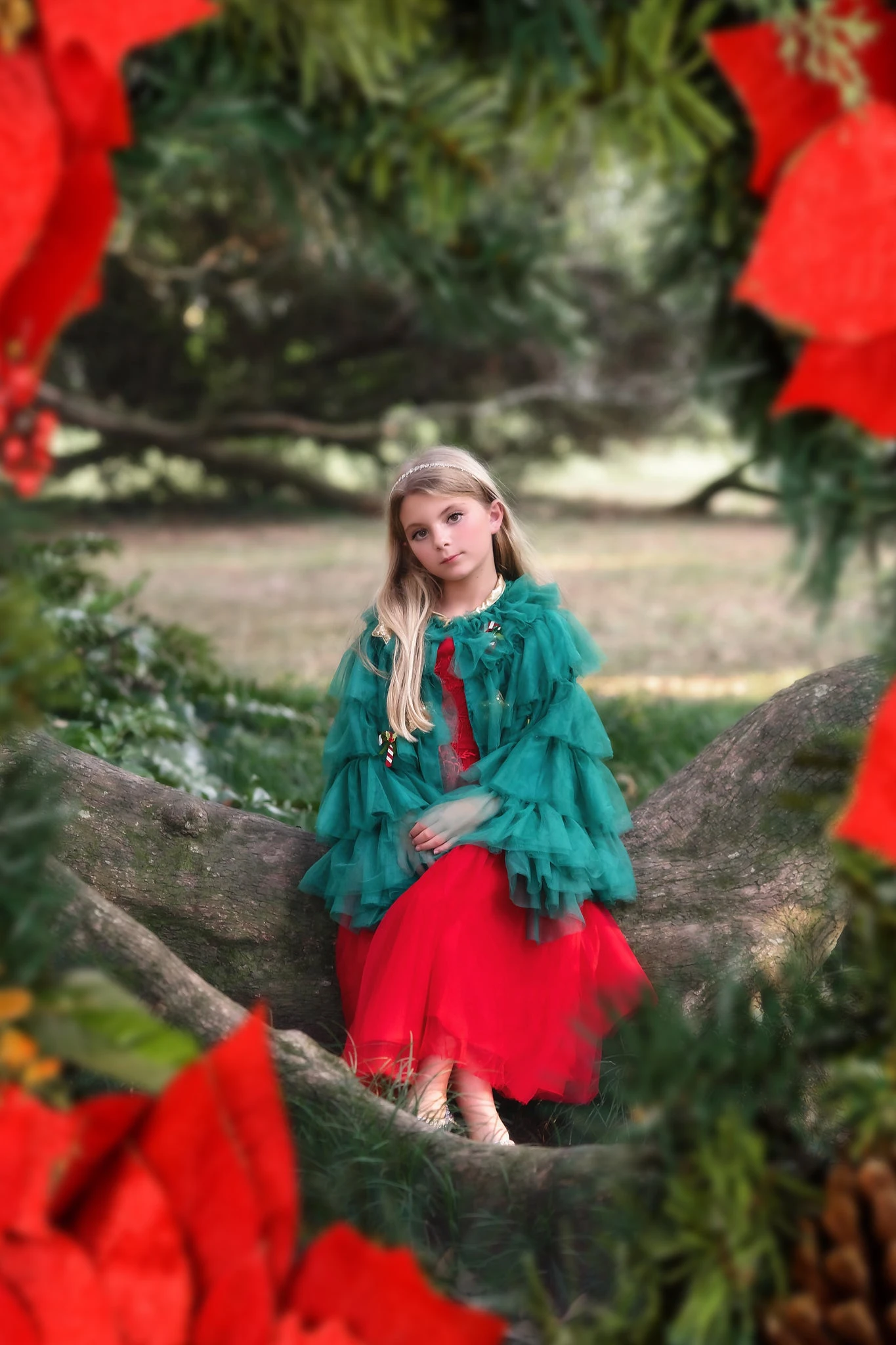 The most darling cape to complete her holiday look! Layers upon layers of ruffled tulle grace this cape, adorned with 8 removable pins for her to customize her look. Pairs wonderfully with any of our gowns for an extra special, formal look, and doubles as a whimsical dress-up piece to be worn at home!