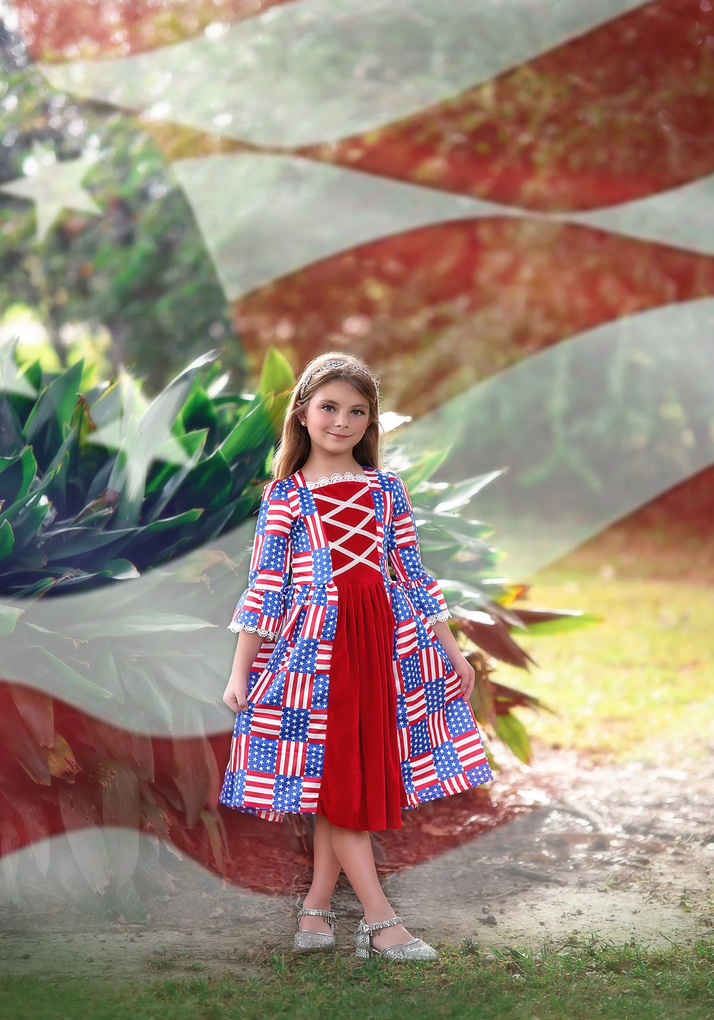 Meet the Historical Heroine! This darling dress features soft cotton velvet graced with a patriotic flag pattern and finished off with sweet lace trimmings. Bell sleeves add the extra touch of glam for her look.