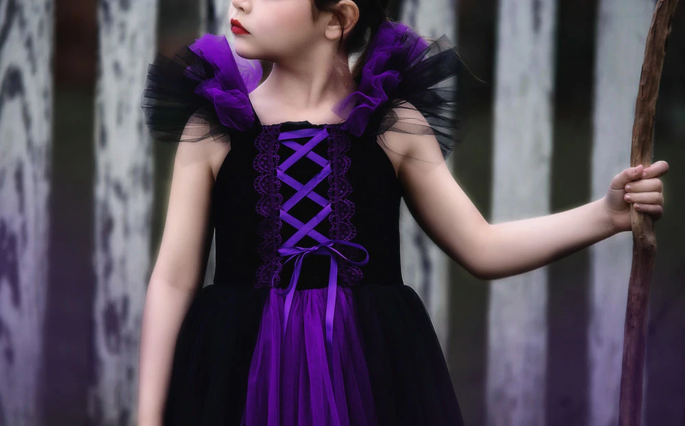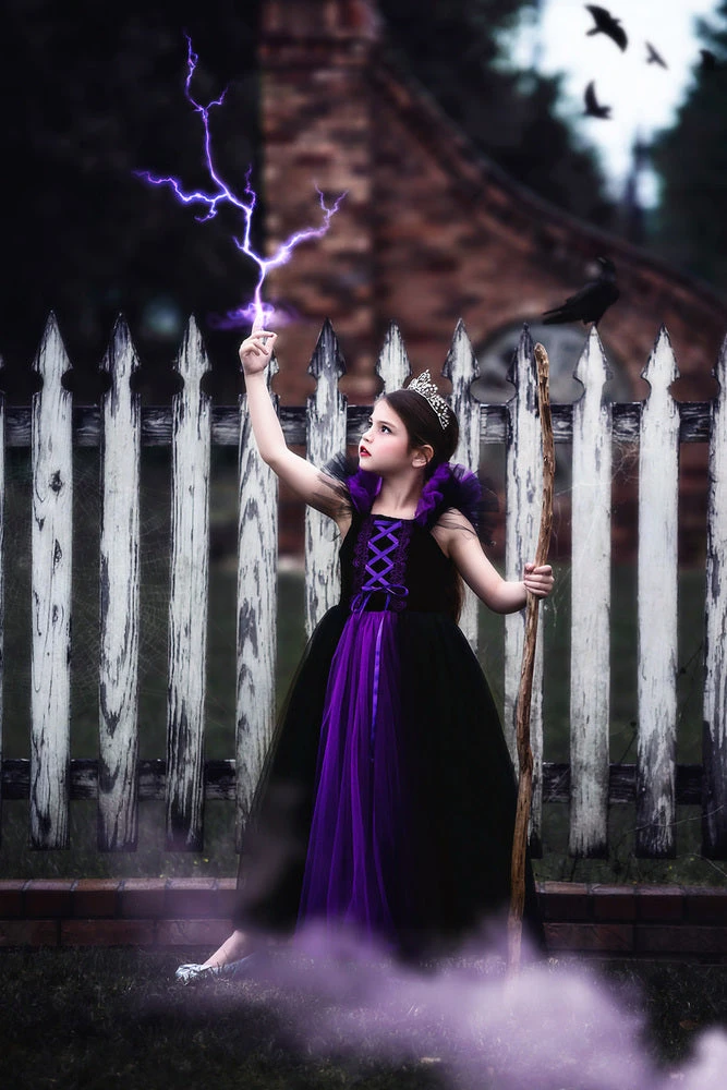 Every good fairy tale needs a villain and this villain princess dress will not disappoint! Bountiful layers of soft black and purple tuling create this magical frock. The bodice is graced with purple trim and laces up the front. The back has a zipper for just the right fit. This dress is not your average costume, it’s luxe quality will have you back to collect more! 100% poly self, soft cotton lining. Machine wash, hang dry. DON’T FORGET HER MATCHING DOLL DRESS!